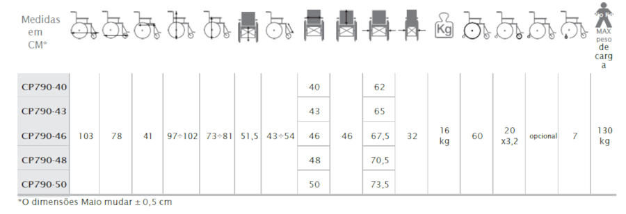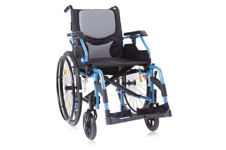 Estrutura: alumínio leve e dobrável, com cruzamento duplo. Rodas traseiras: 24” anti-furo, com desengate rápido. Rodas dianteiras: 8” em PU, ajustáveis. Apoios de braço: ajustáveis, rebatíveis e removíveis. Encosto: tensionável e almofadado. Assento: ajustável em profundidade. Apoio para os pés: ajustável em inclinação. Pegas de empurrar: ajustáveis. Peso máximo suportado: 130kg Dimensões: Largura do assento: 43 cm Peso: 16 Kg. Dimensões máximas: 103cm x entre 97cm a 102cm x 65 cm.