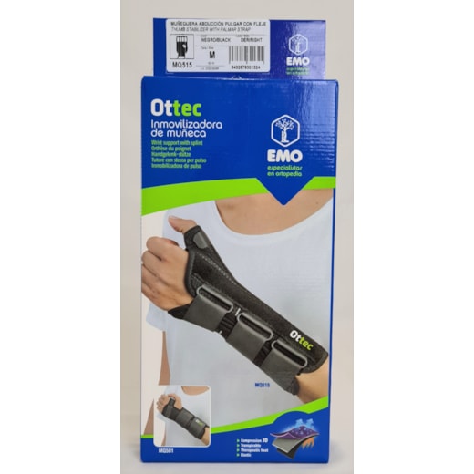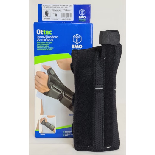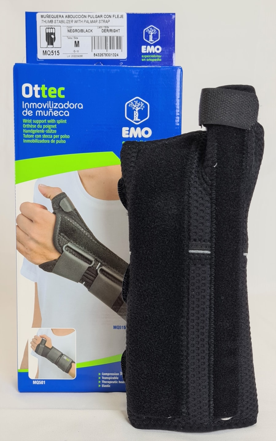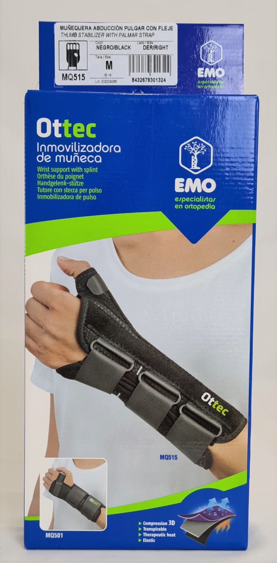 Montagem com uma mão: Lycra elástica sobre a área radial. Fixação de velcro por meio de cintas de velcro ajustáveis. Tratamento antibacteriano Thermy-Tex: inibe o crescimento de bactérias causadoras de odores, crescimento fúngico e absorve o suor. Elasticidade uniforme em todas as direcções: melhor ajuste, ajuste e colocação. Com tala de abdução de alumínio individualmente ajustável e adaptável para estabilização da articulação trapeziometacarpal.